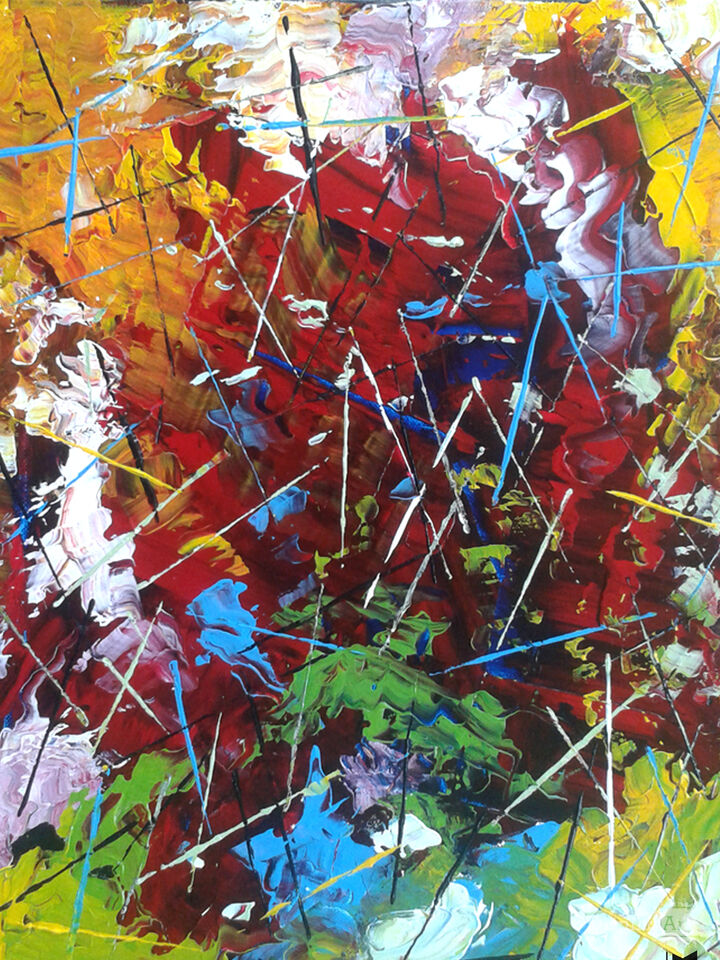 This oil painting was painted without a brush. I used plastic spatulas and putty knives. I was showing the violence committed in a new film I had seem. The colors are equal to the film's main characters. Iron Man and The Incredible Hulk.