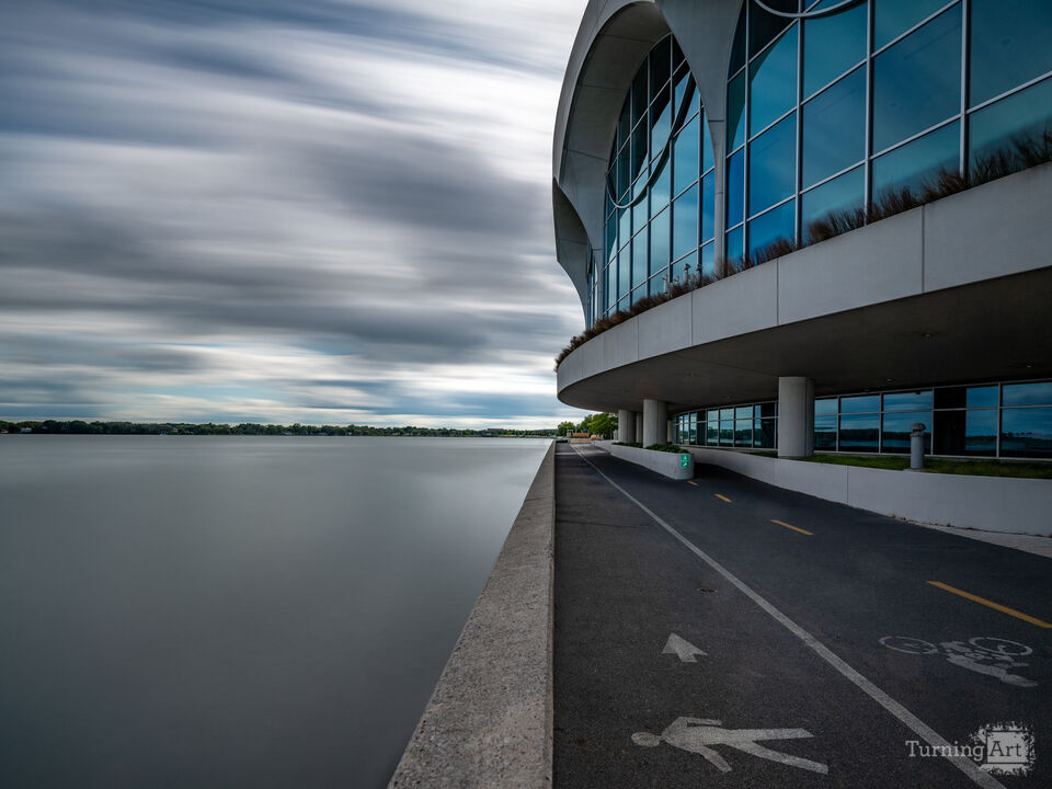 240 second long exposure as the clouds passed by Monona Terrace in Madison, WI USA. Monona Terrace was originally designed and proposed by Frank Lloyd Wright in 1938, but rejected by the Dane County, Wisconsin development board by one vote. Wright would continue to seek support for the plan and alter its design until his death in 1959. For the next four decades, various proposals for a convention center on the Monona Terrace land would be considered and rejected. Several times, it appeared that supporters of the project would be able to secure the public financing to complete the project, but various forces (such as the start of World War II) inevitably sidelined the plan.