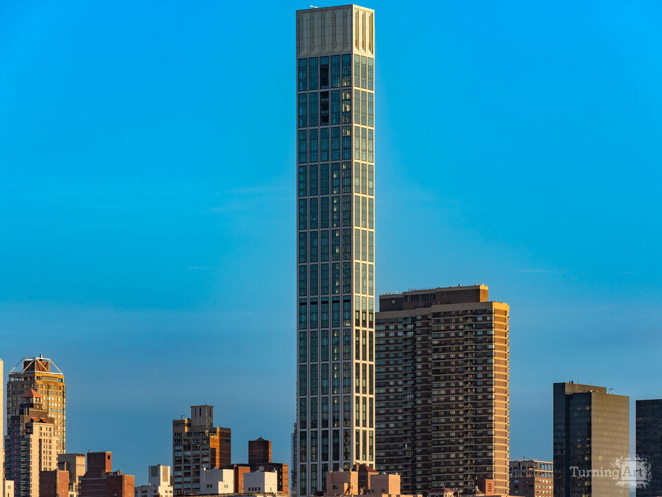 A tall modern apartment building with a white grid facade stands against a clear blue sky in the Sutton Place area of New York City