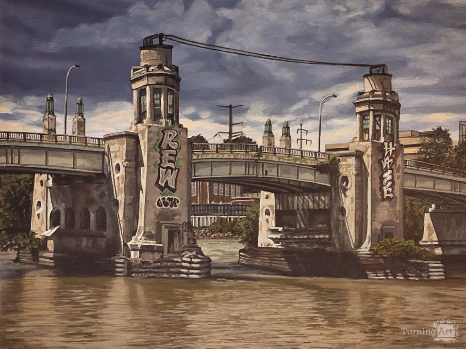 Depiction of the 34th Street bridge in South Philadelphia, crossing the Schuylkill River to University City West Philadelphia. I love this old beaux-arts style draw bridge. Built in the 1930s