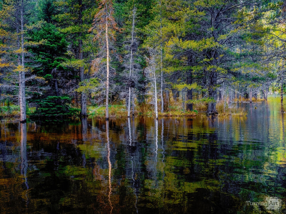 Swollen from snow melt and spring rains, Officer's Gulch Pond in Summit County, Colorado overflows into the surrounding shadowy forest. The rippled reflections in the water mirror the quiet strength of the dense pines along the shore and the late morning light adds a rich sense of mystery and moodiness.
