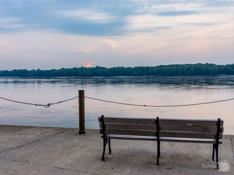 This photograph captures a calm, hazy morning along the riverbank sets the scene as the soft glow of sunrise begins to illuminate the Mississippi River from Cape Girardeau, Missouri, United States. With a bench positioned off to the right side of the composition, the viewer is invited to imagine sitting and watching the day slowly come to life while looking toward Illinois on the opposite shore. The Mississippi, America’s second-longest river, flows roughly 2,350 miles from Lake Itasca to the Gulf of Mexico, shaping landscapes, ecosystems, and generations of history along its path. A quiet moment captured along one of the world’s most iconic waterways.