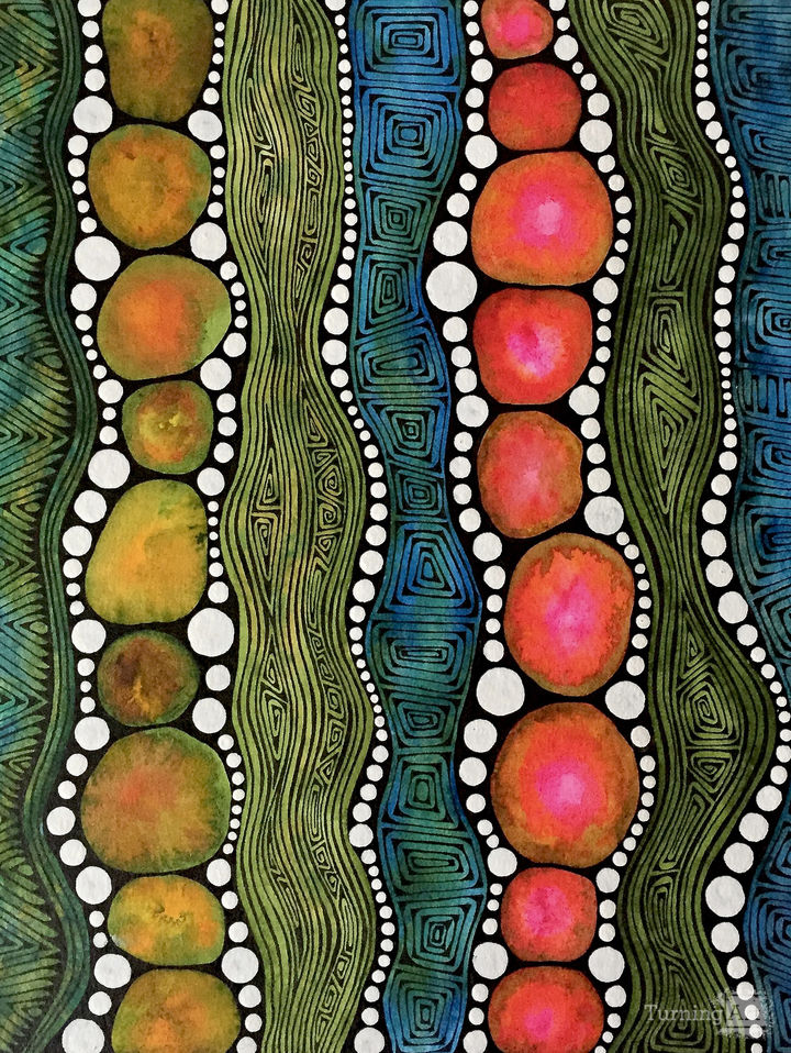 Amy Cunningham-Waltz graduated from Massachusetts College of Art with a BA in Fine Art Photography. Since then she has worked in many different medium such as photography, hand-painted fabric to quilted fiber art and painting. Her current work usually consists of a mix of watercolor, acrylic and ink. Her obsession with patterns grew from her fiber background and have been combined with her lifelong appreciation of the indigenous art of Polynesia, North and South America.