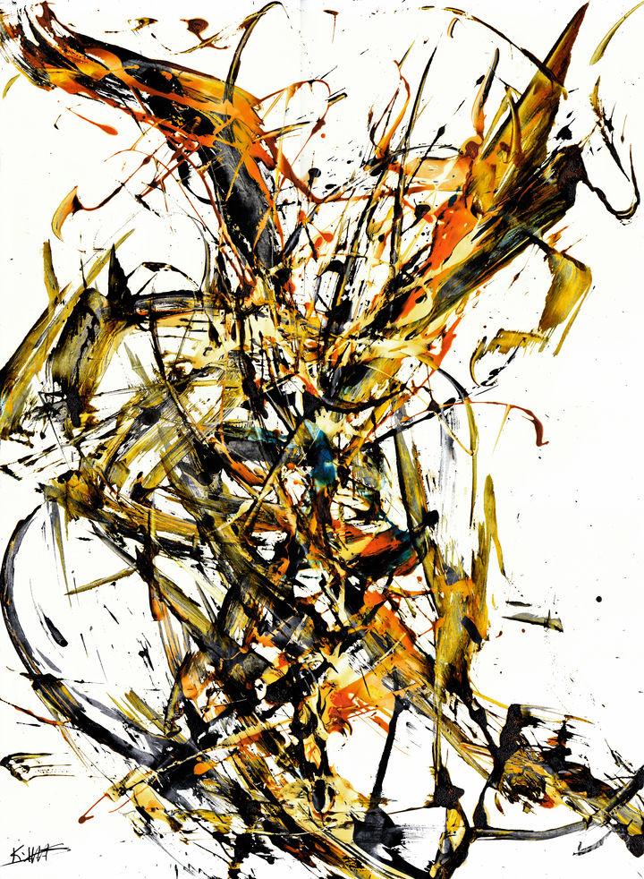 With that said, she is drawn to color, shapes, and movement in that order mostly but not all the time. Kris thinks it is important to give the color space to breathe in order to be understood and really seen and not crowded too much. She likes to give it space to dance, to move, to let the viewer to imagine what the painting could have looked like seconds before it was finished and if it was alive what could it have looked like moments after it was created. This describes her earlier works and in staying true to her nature as a person and artist she evolves to let more complex structures into her life like her recent Disjointed Reality body of work and it's derivative Worn & Torn.