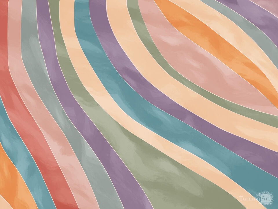 This abstract artwork features soft, wavy bands that flow diagonally across the wall in calm pastel tones—peach, coral, lavender, teal, and muted sage. The hand-painted, watercolor-like texture keeps the pattern relaxed and modern, with a gentle retro vibe. Use it as a wall mural in a living room, nursery, bedroom, or creative studio where you want color without visual clutter. A great choice for contemporary interior design, especially with light woods and simple decor.