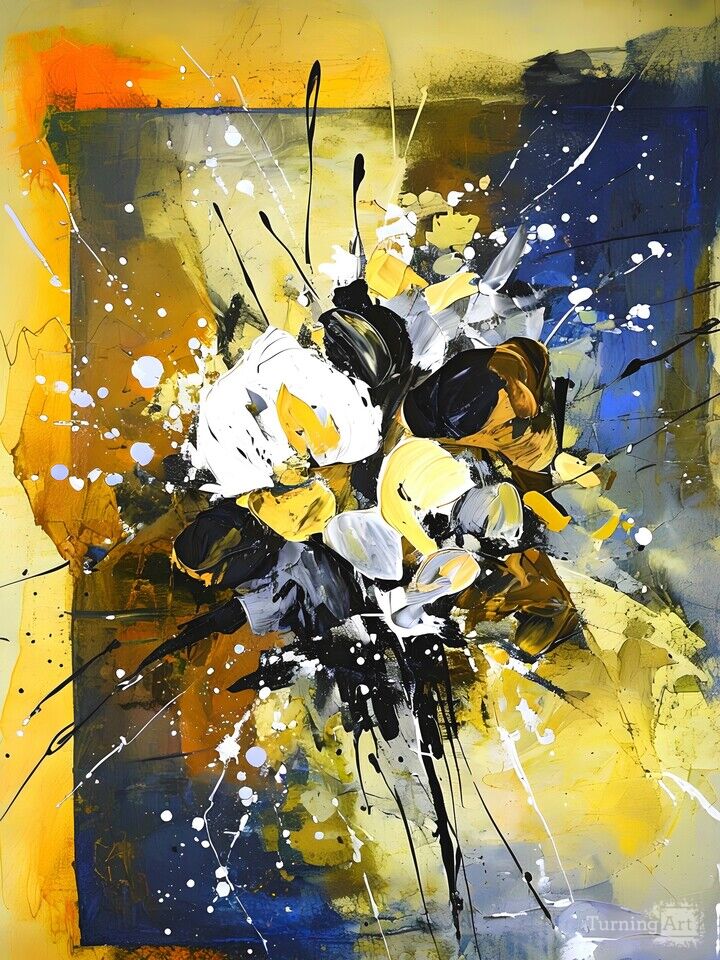 This captivating work is distinguished by its bold and dynamic explosions of color. At the center, a blazing burst of black, white, yellow, and brown creates an energetic focal point, surrounded by controlled projections that add movement and depth. The background, a harmonious blend of blue, yellow, and brown, delicately frames the central composition, accentuating the intensity of the visual impact. The artist uses layering techniques that create a rich and complex texture, allowing each hue to simultaneously distinguish and complement the other. The bold and spontaneous strokes convey a sense of controlled chaos, symbolizing a harmonious dance between passion and balance. This masterpiece evokes intense emotion, prompting the viewer to reflect on the pure energy and beauty of abstraction. With its boldness and balance, it fascinates and stimulates the imagination.
