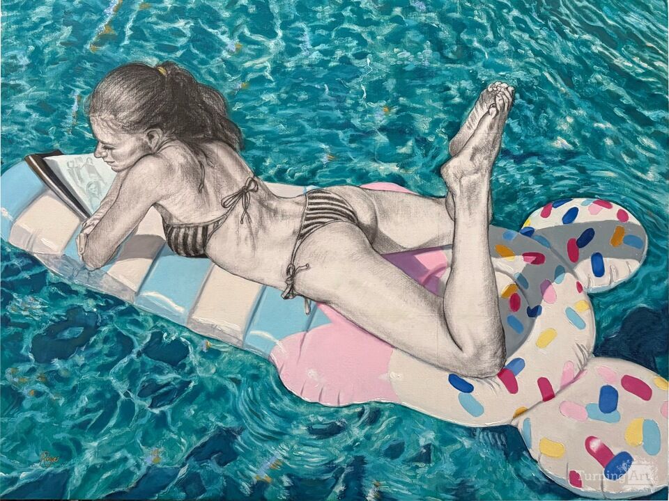 30"x24" oil on canvas of a young woman casually reading a magazine while floating dreamily on an Ice Cream shaped pool float.