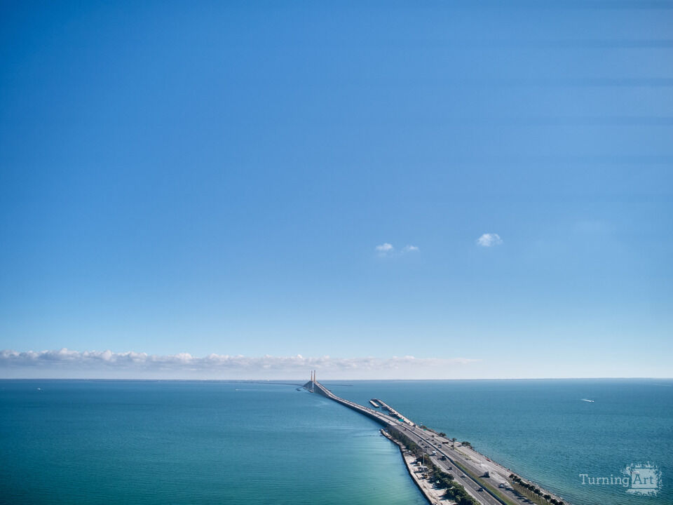 Aerial image of the approach to the Sunshine Skyway Bridge in Lower Tampa Bay showing the approach and the fishing pier