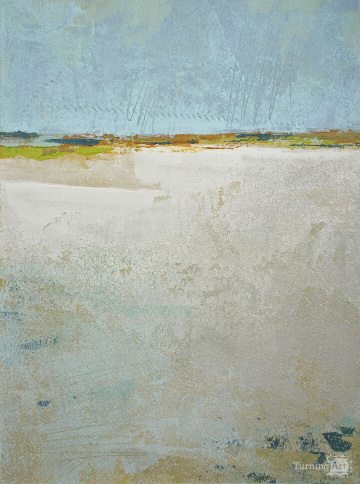 "Alabaster Sands" presents a tranquil landscape with soft, layered tones and a vibrant horizon. A textured beige and pale tan foreground merges with warm orange, green, and deep blue, while a muted sky adds depth. This minimalist composition fosters relaxation and balance, creating a serene retreat that invites clarity and calm.