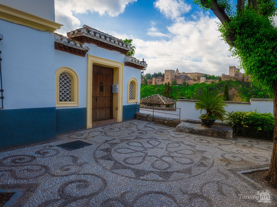 An intimate patio in Granada’s Albaicín with a stunning view of the Alhambra across the valley.