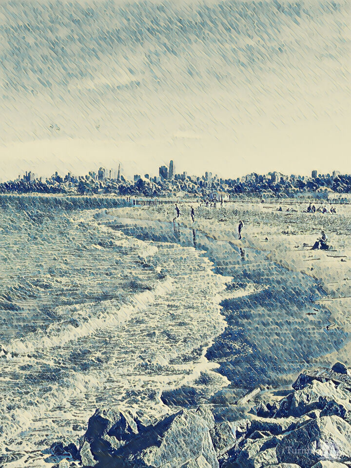 This beautifully textured artwork "Along The Shore 8766" shows the shore on a rainy day. The coastal scene is full of details. The color palette is calming, in shades of blue, the brush-stroke is soft. The topic brings the viewer into a calming scenery. These artworks print up to 70 inches tall, and larger upon special request. Find more art in this style to create art-groupings in your space.