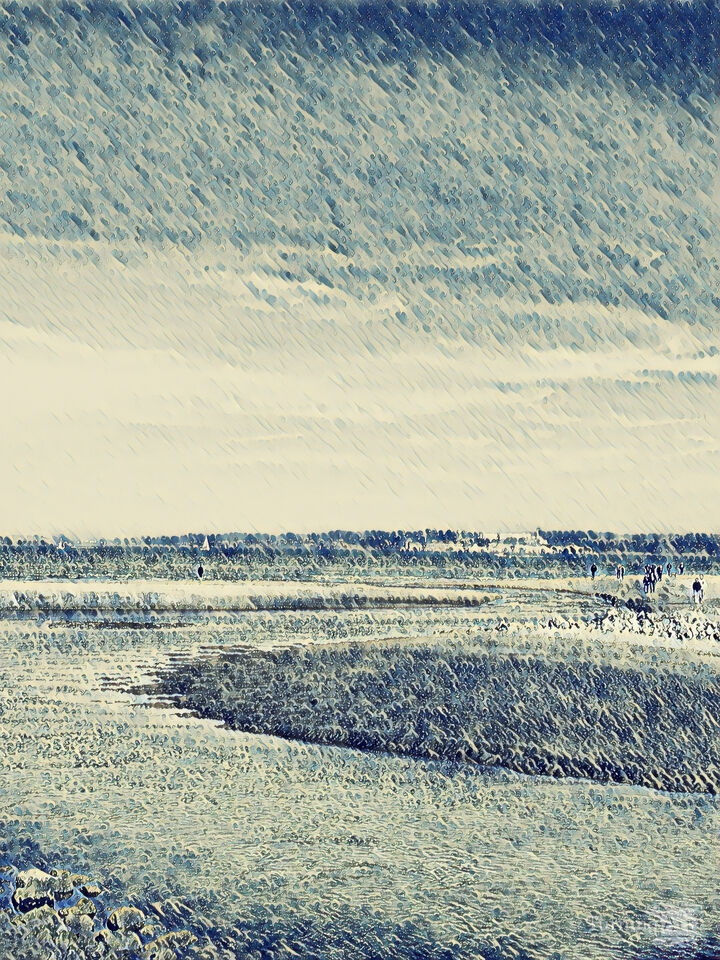 This beautifully textured artwork "Along The Shore 8780" shows people enjoying the shore on a rainy day. The coastal scene is full of details. The color palette is calming, in shades of blue, the brush-stroke is soft. The topic brings the viewer into a calming scenery. These artworks print up to 70 inches tall, and larger upon special request. Find more art in this style to create art-groupings in your space.