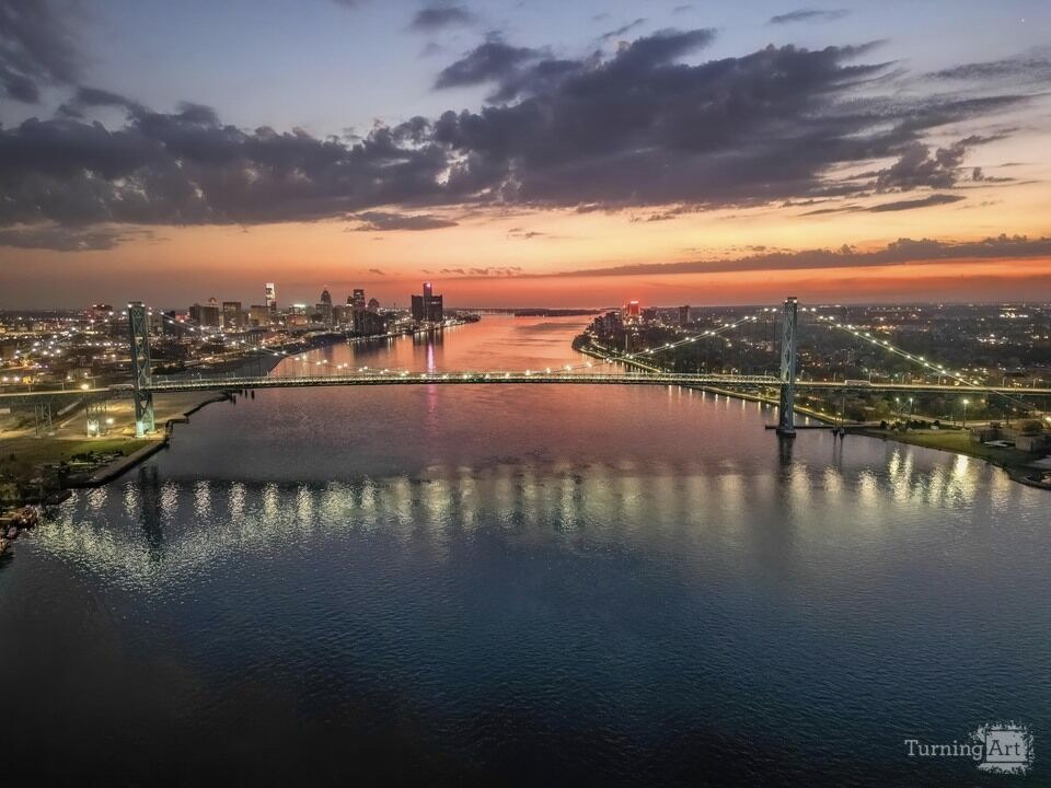 A breathtaking sunrise over the Detroit River highlights the iconic Ambassador Bridge connecting Detroit and Windsor. The city skyline glows beneath a vibrant orange and pink sky, reflected beautifully in the calm morning water — a perfect blend of architecture, light, and tranquility. Ideal for collectors and lovers of Detroit’s skyline.