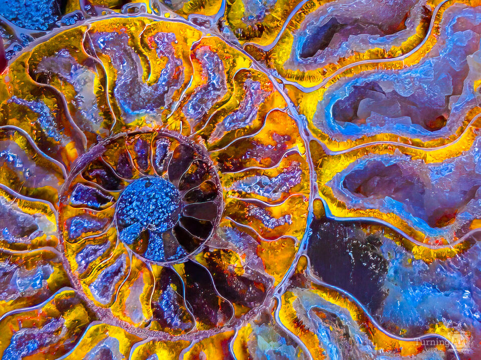 I've always been fascinated with seashell patterns and I had been on the hunt for an ammonite fossil specimen that was sliced open to reveal its structural details: the spiral, curvilinear lines of the shell segments, as well as one that had subtle colors of blue and yellow (my favorite complimentary color combination) that I could enhance. I finally found one.