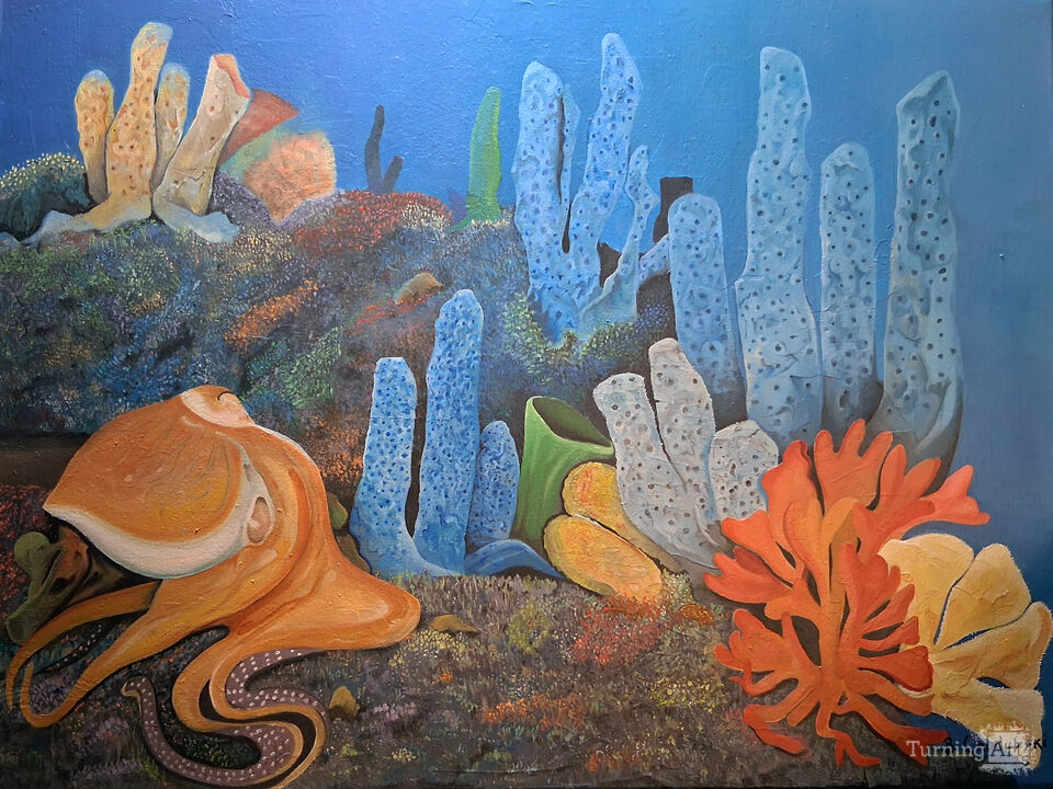 A personal vision of the Beatle's song. An Octopus in a garden of sponges and coral. The type of beauty found in the sea. Colorful and peaceful serenity.