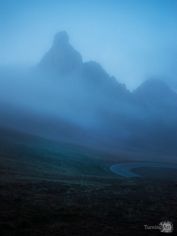 I made this picture during a cold, still dusk at Passo di Giau. The fog rolled in heavy and thick, wrapping the peaks in wispy tendrils. The failing light of day was all blue; a hue portending a sightless night. I wanted to capture that moment — when the world was quiet and half-hidden before slipping into a blind night.