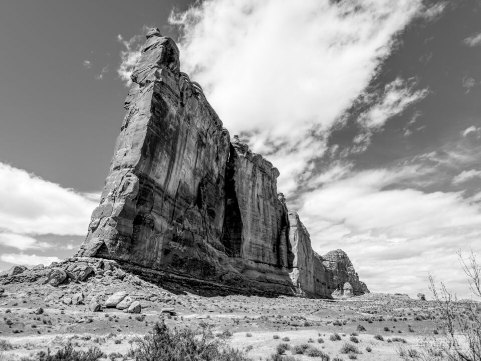 Rising dramatically from the desert landscape, the Courthouse Towers stand as one of the most striking rock formations in Arches National Park in Moab, Utah, USA. This black and white photo captures a towering view looking upward at the massive sandstone monoliths, emphasizing their sheer scale and rugged beauty. Formed from ancient layers of Entrada Sandstone, the vertical rock spire walls resemble the tall buildings of a city skyline, giving the area its courthouse inspired name.