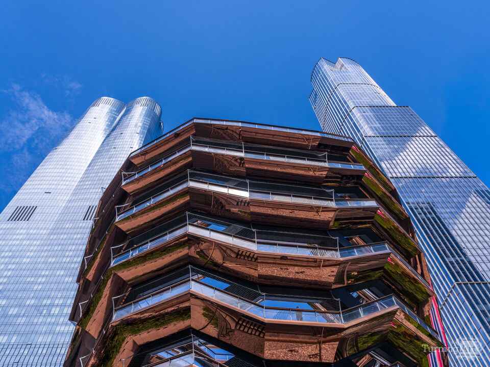 The Vessel, a unique honeycomb-shaped public landmark at Hudson Yards is dramatic in its own right, but I felt that combining it with two very tall modern tower blocks reaching high into the blue sky provided an intriguing contrast of different styles of modern architecture in Manhattan and New York City more broadly.
