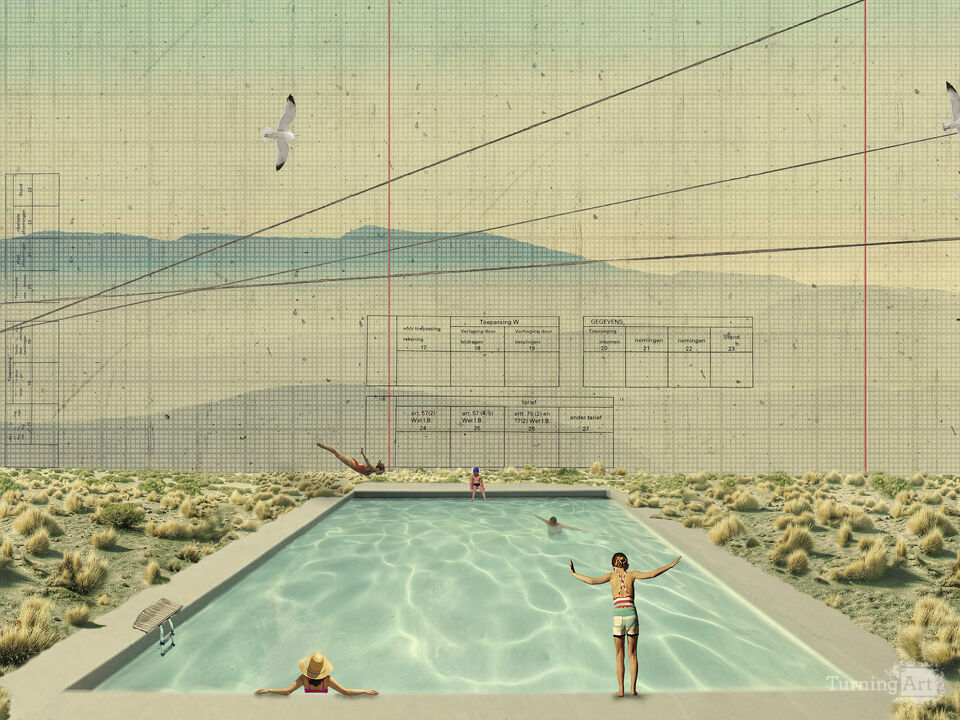 The artwork contrasts the vibrant life in the pool with the desolate background, creating a striking visual dichotomy.