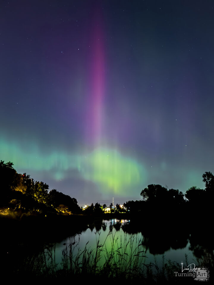 This artwork captures the ethereal dance of the aurora borealis above Shingle Creek in Minneapolis, blending vivid ribbons of green and magenta light with the calm reflection on the water. The interplay between the celestial glow and the silhouetted trees creates a harmonious balance, evoking a sense of wonder and serenity. Inspired by the fleeting beauty of natural phenomena, this piece invites the viewer to pause and connect with the magic of the night sky.