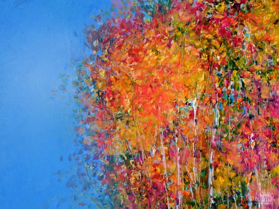 This painting captures a birch trees glowing with vibrant autumn foliage. Bold strokes of red, orange, gold, and green dance against a clear blue sky, blending impressionistic texture with vivid color. The composition evokes a crisp fall day, full of movement, light, and seasonal beauty.