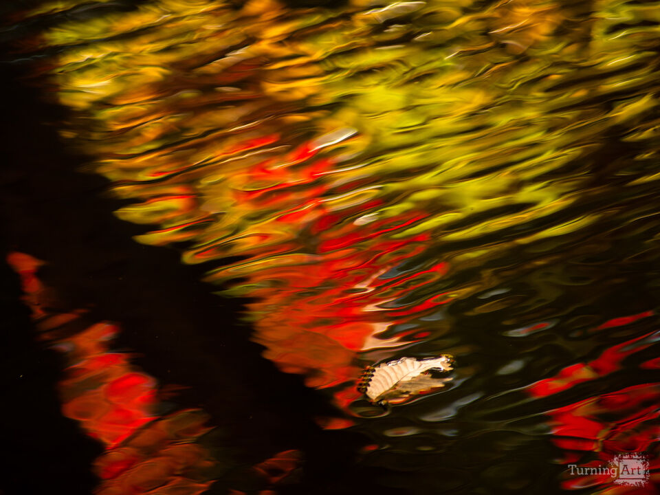 Smooth ripples as the gentle wind blows a lone leaf across the water with autumn reflections.