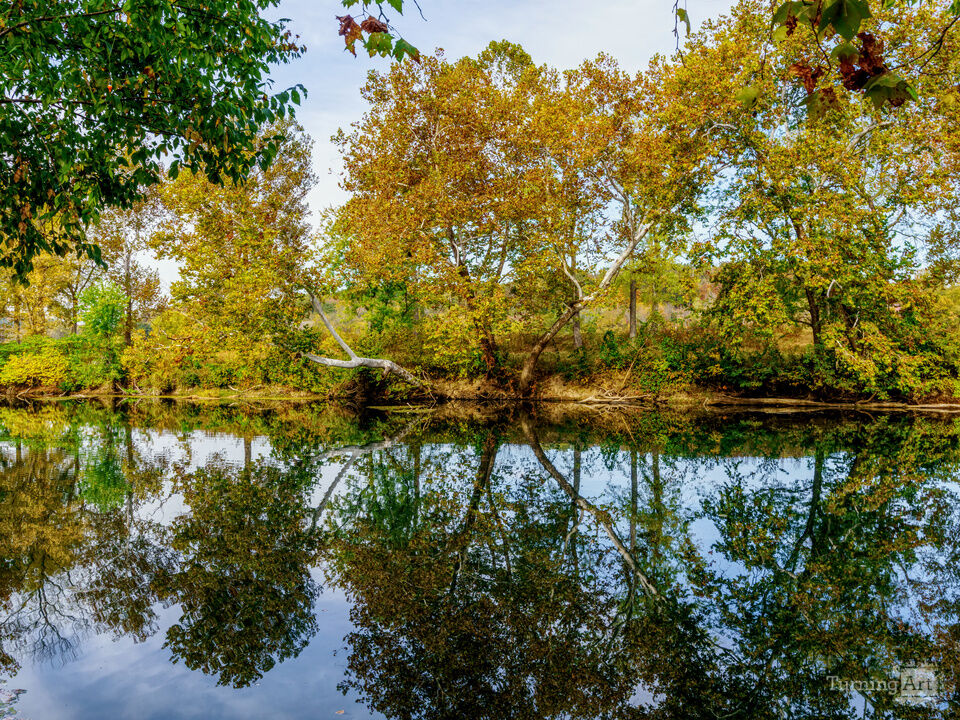 An Ozarks autumn water scene capturing the quiet beauty of colorful trees along a riverbank as they reflect on the calm water of Niangua River. A river birch tree stretches gracefully over the waters. This is where the natural spring waters of Bennett Spring State Park flow into the Niangua River near Lebanon, Missouri, United States. It showcases the crystal-clear spring water and the peaceful charm of the Missouri outdoors.