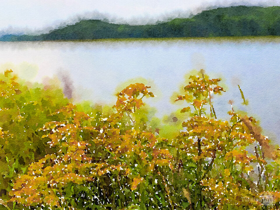 Watercolor nature landscape of Autumn goldenrod flowers by a lake.