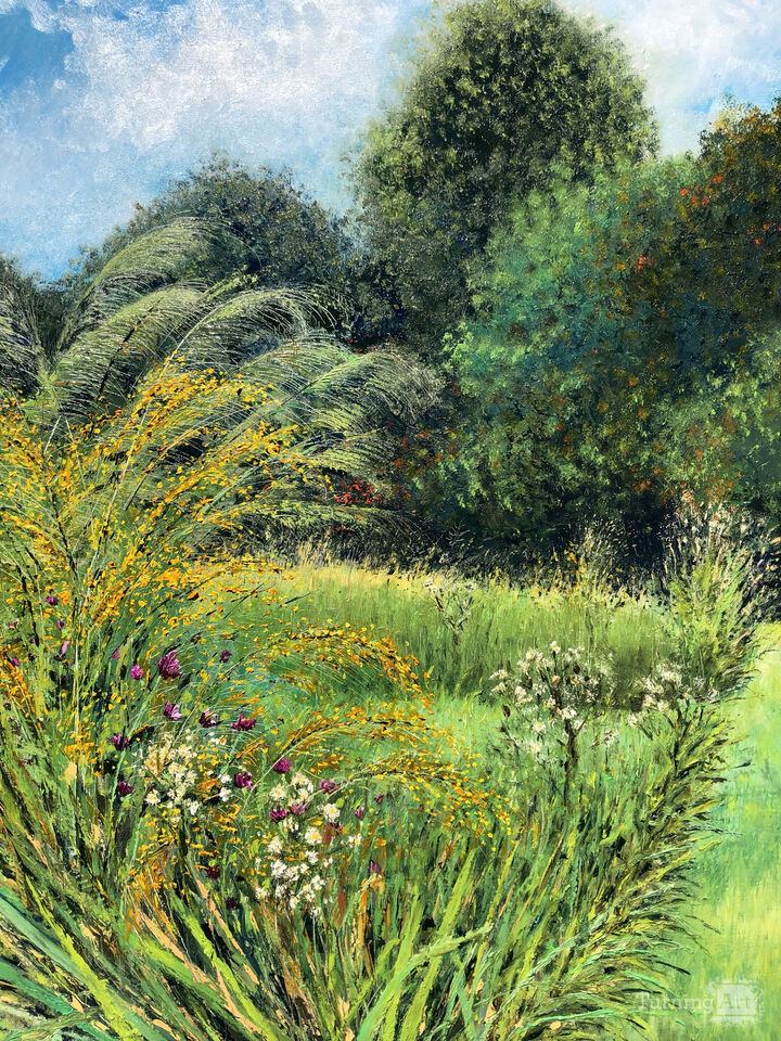 Backyard goldenrod was painted with oils on canvas. I created it outside on an easel in my backyard in North Carolina, where I have a huge field of glorious goldenrod blooming every late August and September.