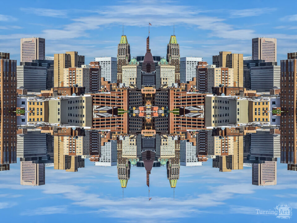 A mirror image of the skyline of Baltimore, Maryland.