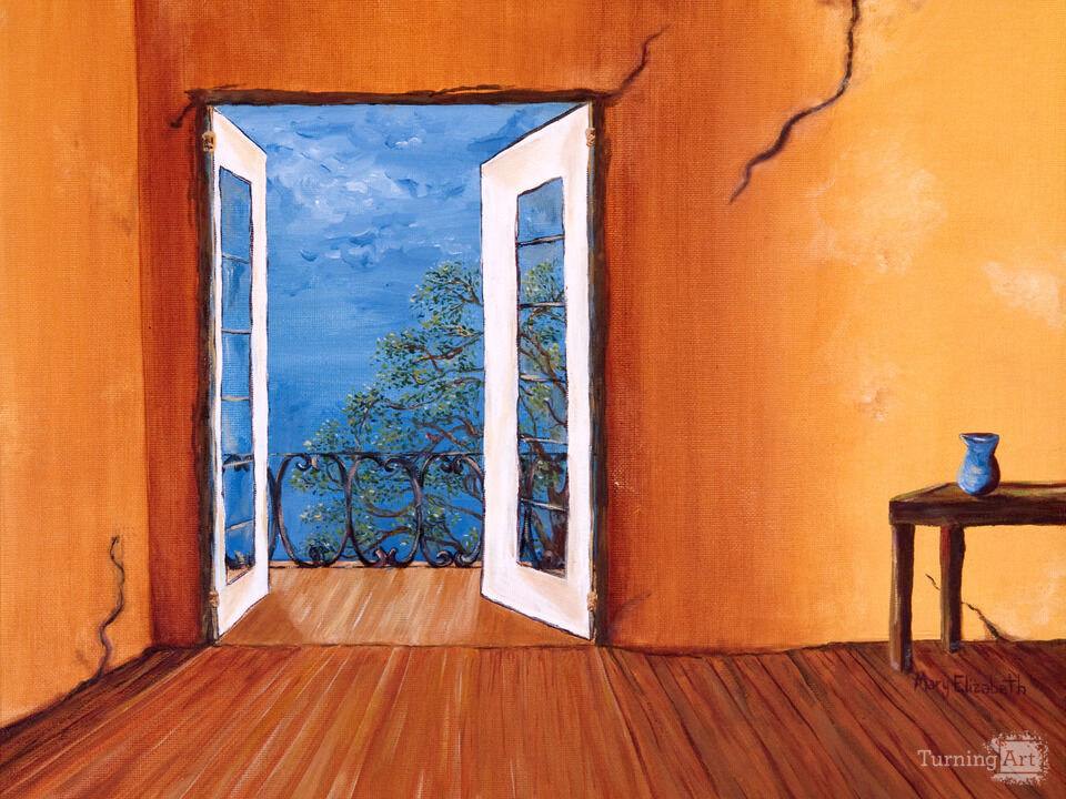 An oil painting on canvas. It's of a run down hostel I stayed at in Barcelona. Some stairs were missing, the ceiling was leaking and there were cracks in the walls. There was no air-conditioning. Just the open window, the sea breeze and the wonderful sounds of Spain drifting into the room.