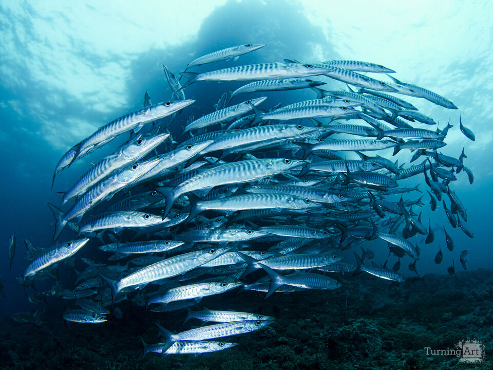 A school of barracuda circles a small offshore island in Raja Ampat, Indonesia. I was able to swim quite close to the school as they slowly made their way to the surface waters.