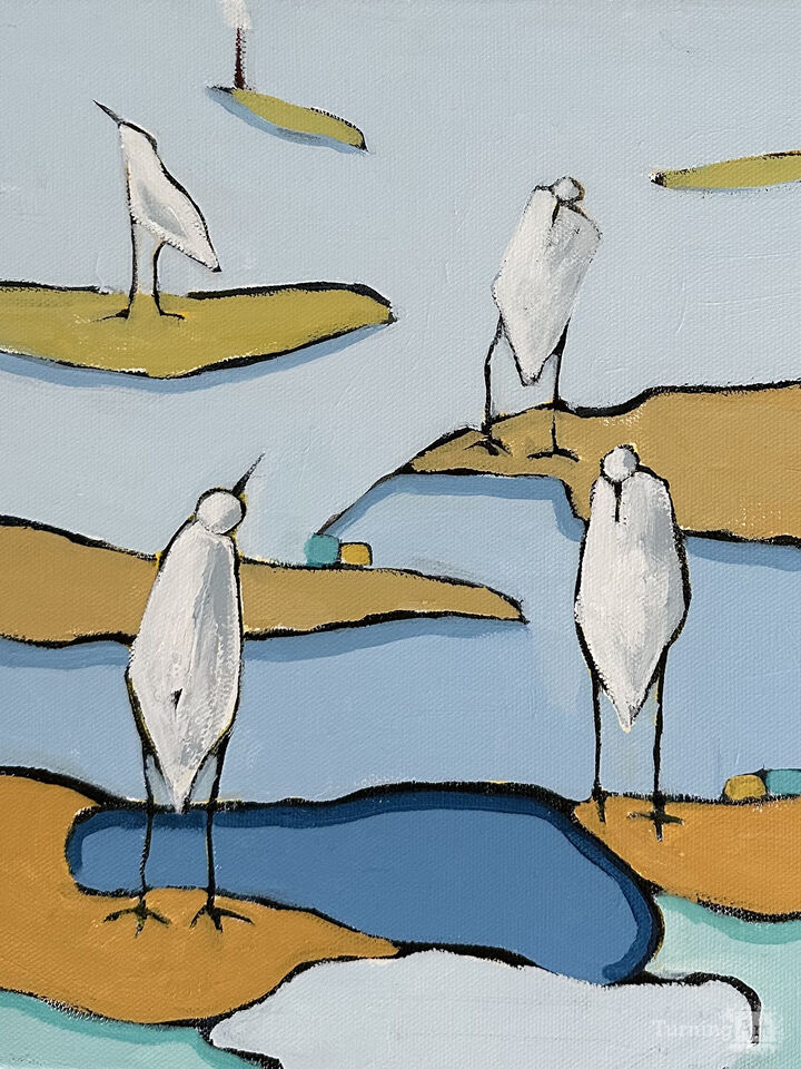 I enjoy playing around with the shapes of the many marsh birds that come and visit the marshes on the river every summer, its fun to give them different personalities and creating a whimsical place for them to hang.