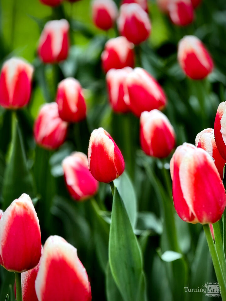 The tulips stood at attention, their red and white petals glistening with the last touch of rain. Each droplet caught the soft morning light, turning the field into a sea of brilliance. The air felt fresh and renewed – it was one of those rare moments that seemed to hold promise itself.