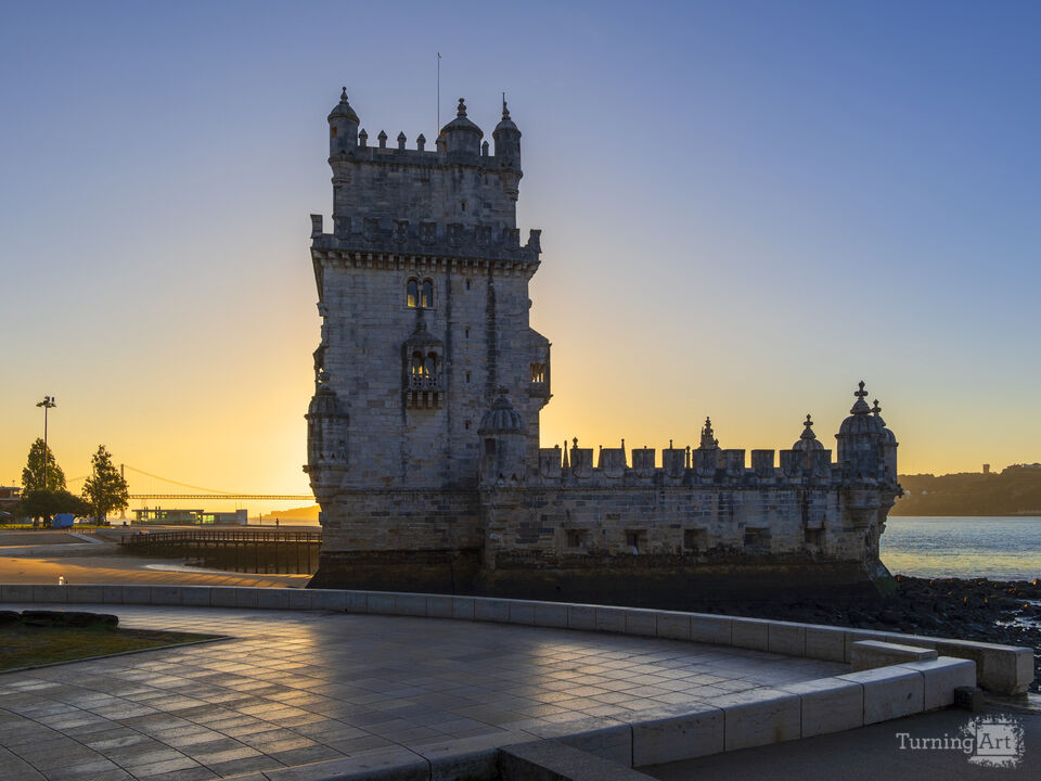 The Belem Tower historic fortification on the banks of the Tagus River in city Lisbon, Portugal. Landmark from the 16th century made from lioz limestone as seen in the morning against the rising sun. Known also as Tower of Saint Vincent, built in Manueline style, Portuguese Late Gothic architecture.