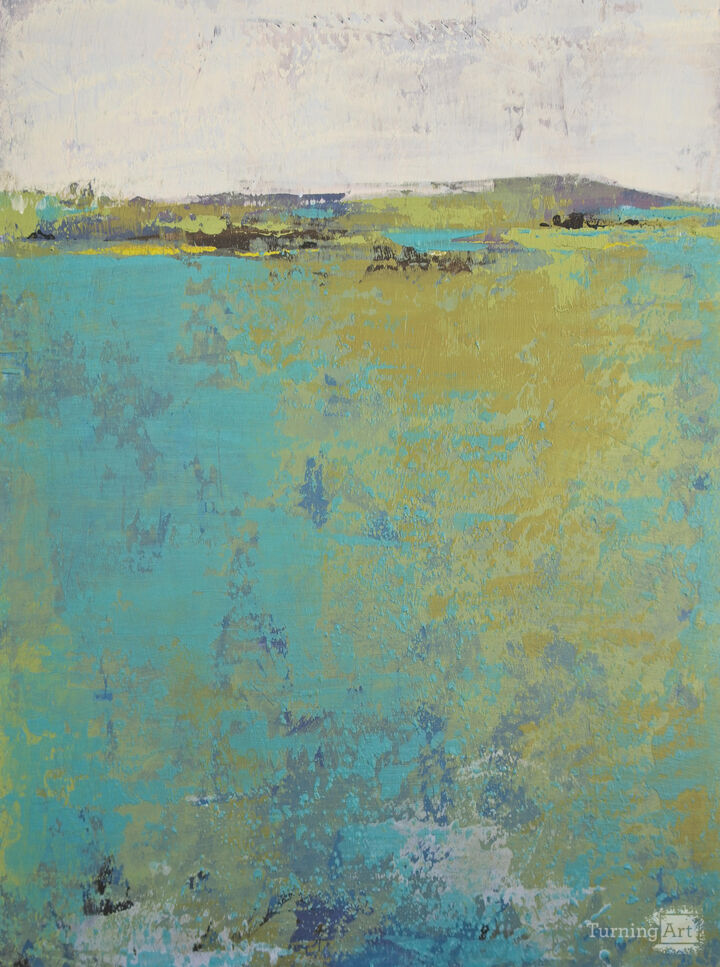 This vibrant, tranquil seascape unfolds in layered bands of turquoise and green, flowing beneath a soft, off-white sky and grounded by a deep horizon. Warm, muted yellows add depth, while delicate textures evoke a serene, abstract landscape. "Belize Bouquet" fosters relaxation and balance, making it an ideal addition to any space seeking calm and quiet reflection.