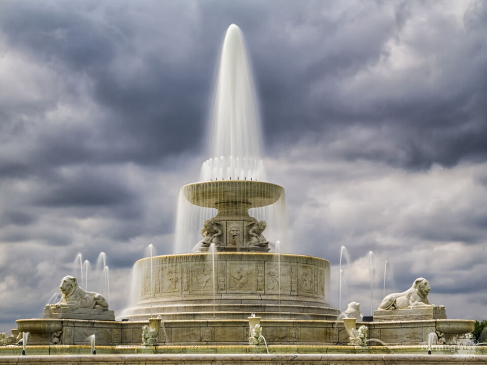 The beautiful water fountain is enhanced by slow shutter speed to create a silky flow. The dark clouds provide a nice contrast to illuminate the moving water.