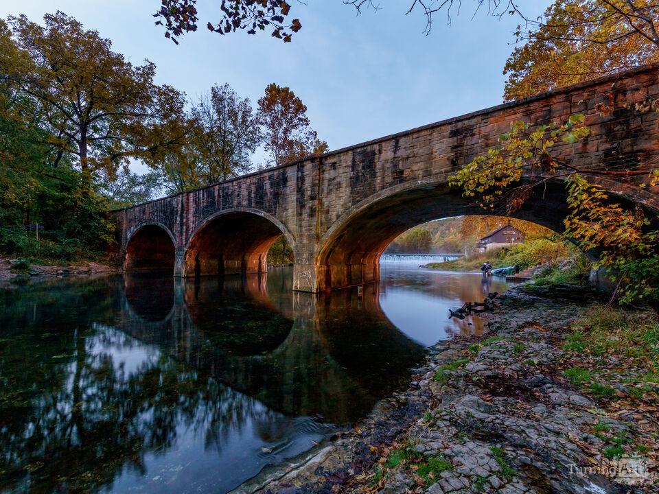 A stone triple arched bridge crosses over the flowing crisp spring waters of Bennett Spring State Park near Lebanon, Missouri on an early fall season morning. Some fly fishermen stand in the cold water fishing for trout. It was the perfect way to start the day in the Ozarks. A waterfall flowing from a dam is on the other side of the bridge. The calm water reflects the colorful trees and blue sky. It's one of the first state parks in Missouri and the natural spring produces around 100 million gallons of water daily!