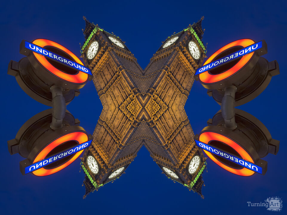 Mirror image of Big Ben and the Underground sign in front of it. London, UK.