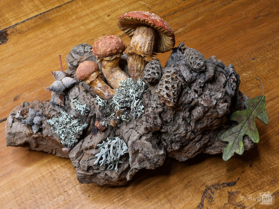 Yes, these mushrooms are called Big Laughing Jim mushrooms that grow in the forest. With this sculpture, I have created a small window into the micro world of the forest floor. I usually meander through a forest or natural landscape with my head down, searching for tiny treasures that are readily found by the observant viewer. I have created these miniature views of the wilderness for people to admire the wonders of the natural world. Depending on the sculpture, the mushrooms, leaves and berries, and assorted other natural object found in nature are sculpted with various types of clay. These are then paired with found naturally occurring objects from the forest, including old pieces of wood and bark, pinecones, acorns, feathers, lichen, and moss. When completed, these sculptures create a window into the tiny world of the forest floor.