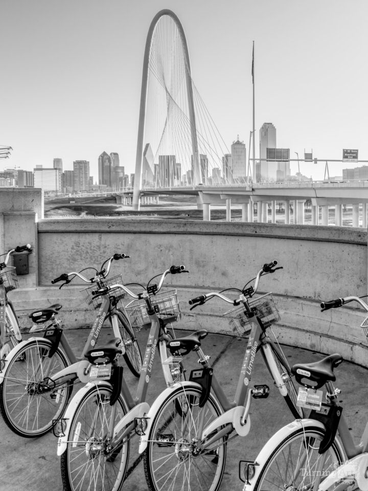 A black and white subtle hazy morning at sunrise as I was standing by some rental bikes taken on the Ronald Kirk Pedestrian Bridge in Dallas Texas, United States. In the distance is the Margaret Hunt Hill bridge which opened in March 2012 and was part of the Trinity River Project. There was a slight haze to the atmosphere giving the city skyline a soft look. I love how the sunlight is making the bottom portion of the bridge glow. The cable-stayed bridge connects highway 366 (Woodall Rodgers Freeway) in downtown Dallas to Singleton Boulevard in West Dallas. Dallas, Texas is the 3rd largest city in Texas, and 9th largest in the USA. Dallas is also one of the fastest growing cities in the U.S.