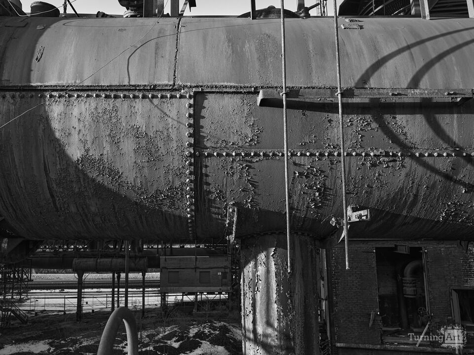 Black and white images of parts of the Bethlehem Steelworks in Pennsylvania detailing the peeling paint and rust as the setting sun brings out the details