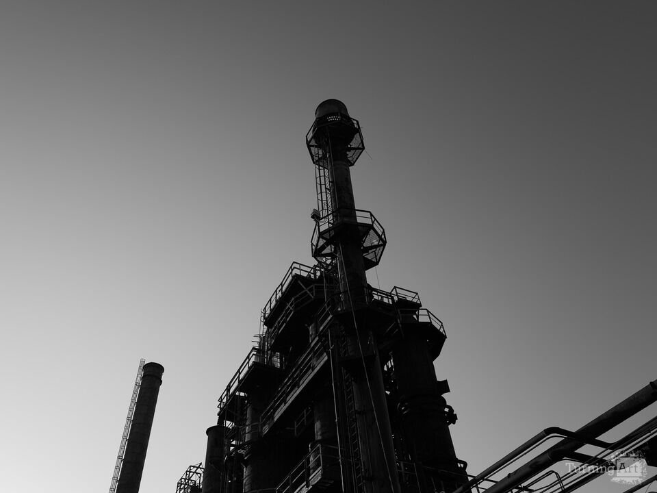 Black and white of the Bethlehem Steelworks in Pennsylvania in late afternoon light looking up at the massive structure