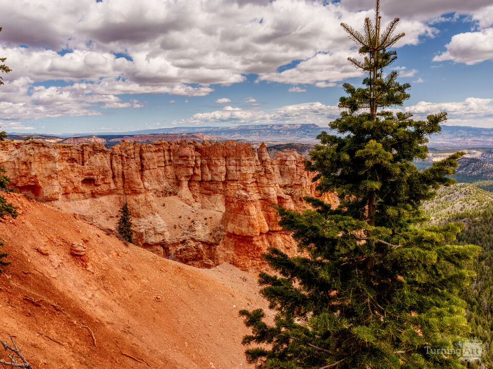 An expansive view from Black Birch Canyon in Bryce Canyon National Park, Utah, USA on a beautiful afternoon. Fluffy cumulus clouds add softness to the bold orange spires and hoodoos of the canyon. A tall pine tree frames the limestone rock formations. In the distance, the vista extends for more than 100 miles across the layered cliffs of the Grand Staircase, revealing the vast and timeless beauty of the Bryce Canyon landscape.