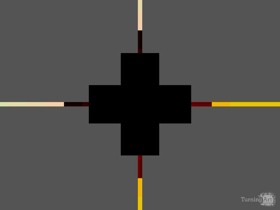 His "Digital Suprematism" series that is showcased on TurningArt works with shape, form, color, and line to produce abstractions that when greatly enlarged, provide an excitation factor via the elements of Geometry. These bold pieces … stemming from the pixel … rival Color-field, Minimalist, and Geometric art works created by painters over many decades. Their design aspects complement industrial and aesthetic surroundings.