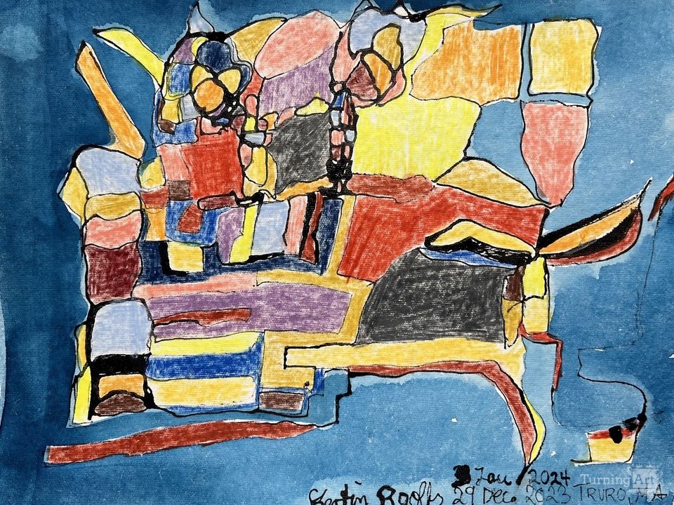 Abstract, automatic drawing on handmade paper with colored pencil.