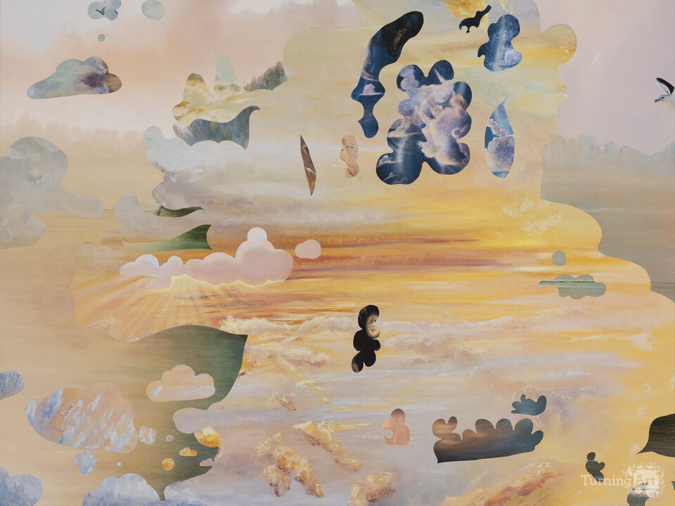 My aesthetic visualization of some such possibilities as paintings were inspired by reading about quantum loop theory in the books of Carlo Rovelli, including “The Order of Time” and “Reality is Not What it Seems.” In the series multiple versions of the same sky or multiple different skies are depicted within one image, suggesting that multiple understandings of reality could be simultaneously valid.