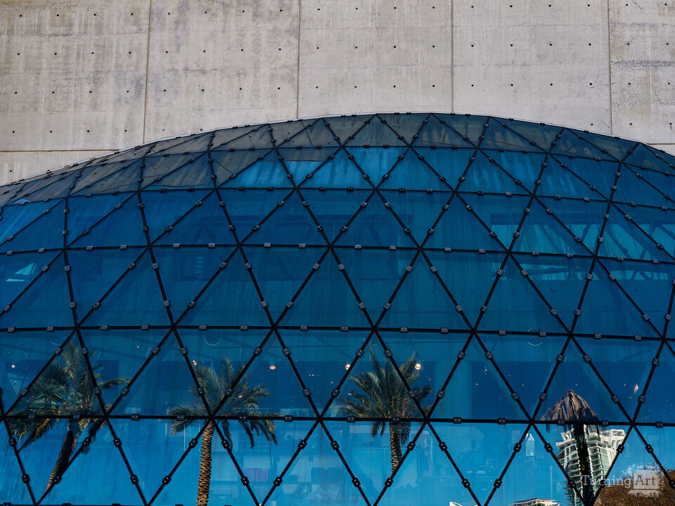 The blue sphere at the Salvador Dali museum with palm trees reflected in the deep blue of glass and sky