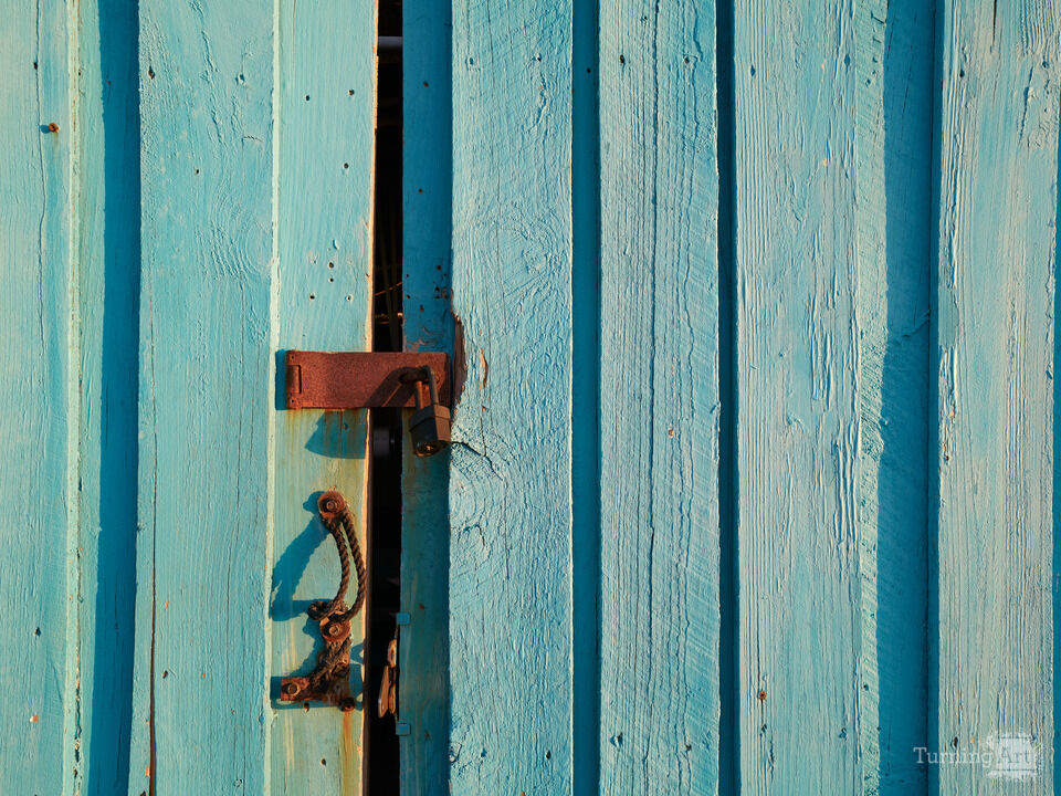 Sunrise lights up a weathered blue door as well as the lock and hinge keeping the door closed to the beach weather