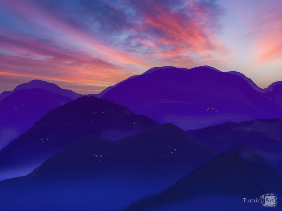 This artwork, with its overlapping mountain silhouettes in rich blues and purples, achieves a remarkable sense of depth and tranquility. The choice of these cool, saturated tones for the mountains not only guides the viewer's gaze layer by layer into the distance, but also evokes a peaceful, contemplative mood. The atmospheric perspective demonstrates a strong grasp of value and form, inviting viewers to almost step inside the landscape and lose themselves amidst the gentle folds of the mountains.